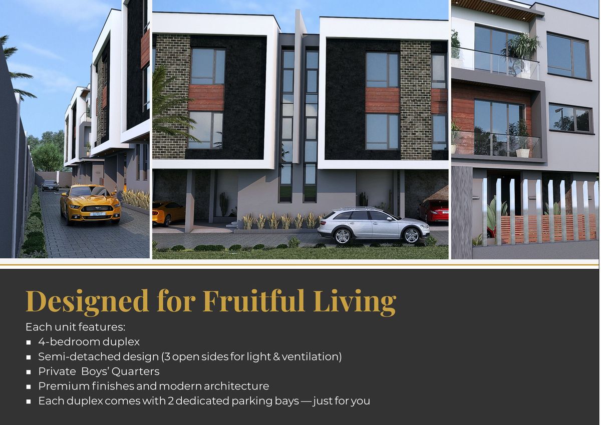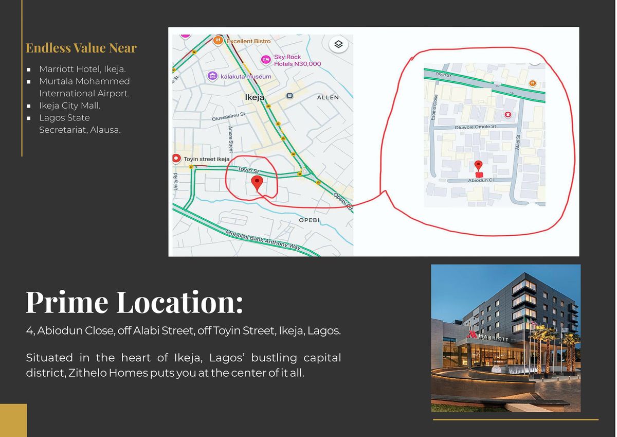 Spacious 4-bedroom semi-detached duplexes with BQ in the heart of Ikeja — steps from Marriott Hotel, Ikeja City Mall, and M.M. International Airport. Contemporary luxury finishes, 24/7 power, CCTV, and walk-in closets throughout.
